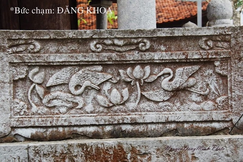 Chim sẻ (Tước), hươu (Lộc) cây Lựu biểu tượng đông con nhiều cháu, Khỉ (Hầu), Ong (Phong), cây đào tượng trưng cho trường thọ. Ý nghĩa của bức chạm thể hiện ước mong được thăng quan tiến chức, đông con nhiều cháu, đời đời hưởng phúc lộc.