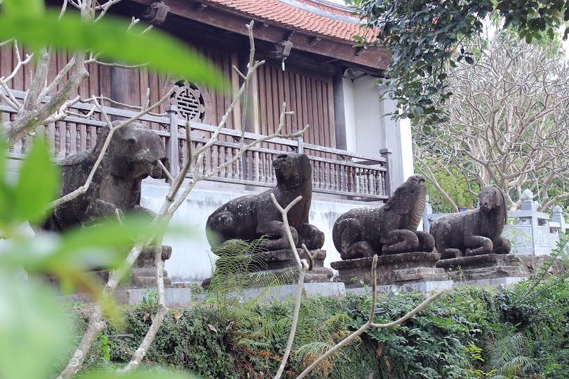 Hàng Linh thú tạc bằng đá xanh nguyên khối trước tòa Tam bảo, được công nhận là Bảo vật Quốc gia năm 2017