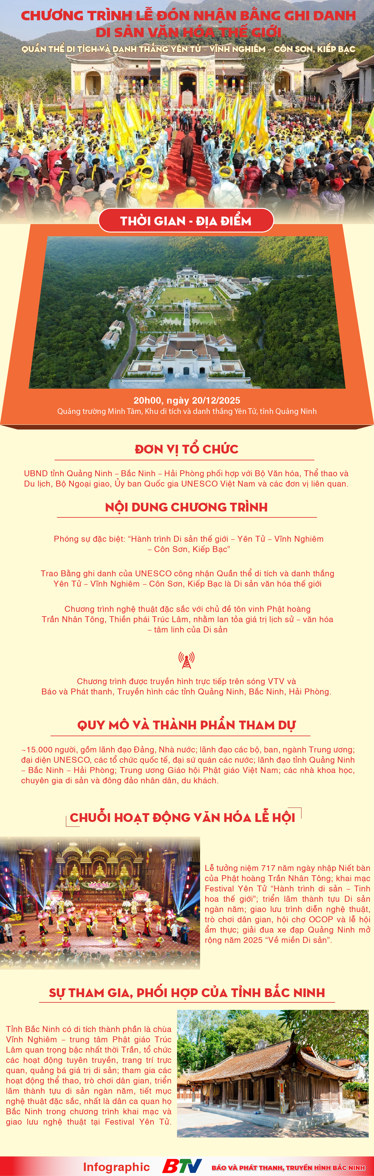 Tối 20/12/2025, tại Quảng trường Minh Tâm, phường Yên Tử, tỉnh Quảng Ninh, diễn ra Lễ đón nhận Bằng ghi danh của UNESCO công nhận Quần thể di tích và danh thắng Yên Tử - Vĩnh Nghiêm - Côn Sơn, Kiếp Bạc là Di sản văn hóa thế giới. Sự kiện có ý nghĩa đặc biệt quan trọng, khẳng định giá trị lịch sử, văn hóa, tâm linh của Thiền phái Trúc Lâm Yên Tử, đồng thời nâng cao vị thế và hình ảnh văn hóa Việt Nam trên trường quốc tế.