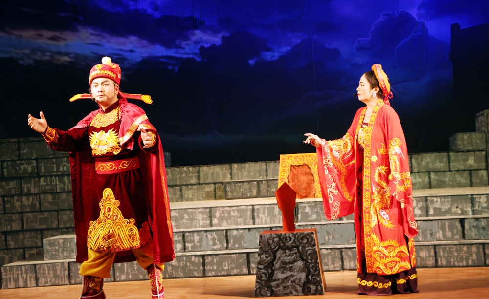 Nghệ sĩ Ưu tú Quỳnh Mai và nghệ sĩ Bá Chung thể hiện nhân vật Thái sư Trần Thủ Độ và Linh Từ Quốc Mẫu Trần Thị Dung trong vở diễn "Thiên mệnh". |