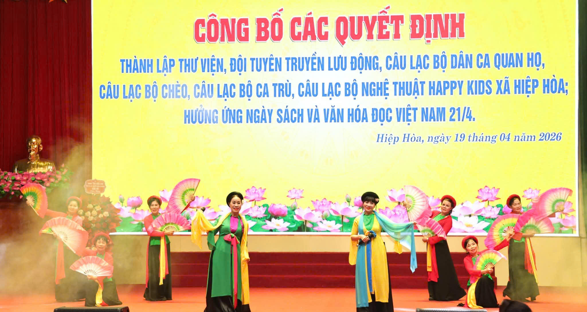Ngày 19/4, UBND xã Hiệp Hòa long trọng tổ chức Hội nghị công bố các quyết định thành lập Thư viện xã; Đội tuyên truyền lưu động; các Câu lạc bộ (CLB) Ca trù, Chèo, dân ca Quan họ và CLB Nghệ thuật. Đây là dấu mốc quan trọng, thể hiện sự quan tâm của cấp ủy, chính quyền địa phương đối với việc bảo tồn, phát huy giá trị văn hóa truyền thống gắn với xây dựng đời sống văn hóa cơ sở.